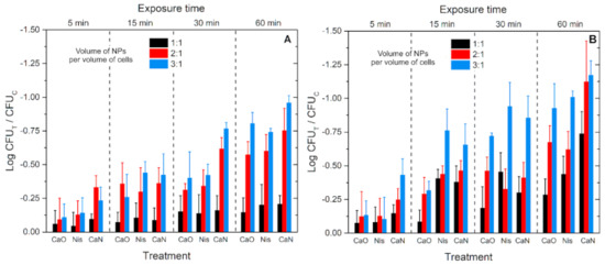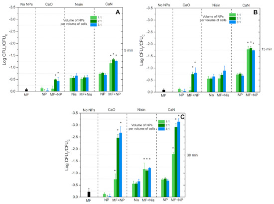 Similarly to the low AMF treatment, the MF-only (125 mT, 200 kHz) procedure resulted in a minor decrease of the cell viability (independent of the exposure time). Nevertheless, in the case of high AMFs, the 5 min protocol (Figure 8A) triggered a statistically significant difference in the inactivation rate when CaO nisin-free NPs were used, contrary to the 10 mT treatment.