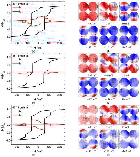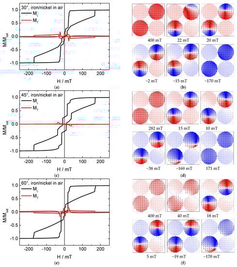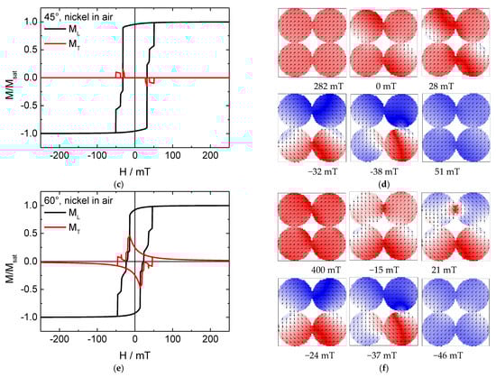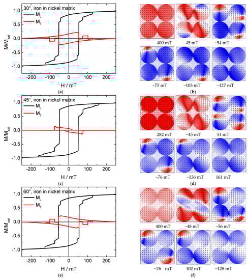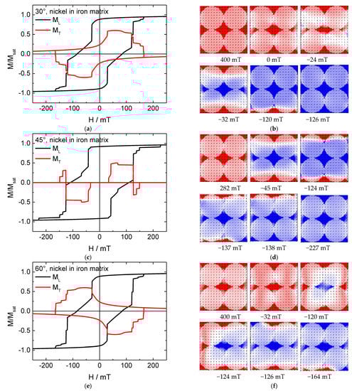 Here, the behavior is completely different. In the hysteresis loops simulated for 45° (Figure 6c), there are strong jumps in addition to several smaller ones, combined with a large transverse magnetization component which even changes signs on either side of the loop. In the systems with Fe nanodots, this energetically unfavorable configuration of a large fraction of the magnetization being perpendicular to the external magnetic field could be avoided by building vortex states, which is not usual in materials like nickel or permalloy with their small magneto-crystalline anisotropies []. Indeed, magnetization reversal snapshots show no vortices here, either in the nickel nanodots or in the iron antidot matrix where vortices are impeded by the shape.