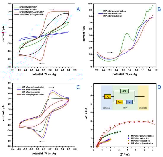 CV characterization of MIP and NIP sensors developed on SPCE-MWCNT and SPCE-MWCNT/AgNP electrodes (A); SWVs of a 0.1 mol L−1 MDPV solution after polymerization, extraction and incubation steps (B); Characterization of the step-by-step construction of the SPCE-MWCNT/AgNP-MIP sensor through CV (C) and EIS Nyquist diagrams with suitable fitting (the circuit used is shown within the figure) (D). Measurements (A,C,D) were performed using a 50 μL PBS solution containing 2.5 mmol L–1 [Fe (CN)6)]3−/4− and 0.1 mol L–1 KCl.