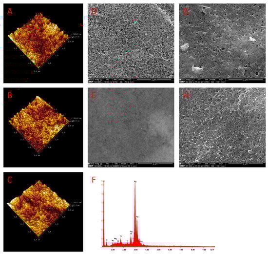 The electrodes’ surfaces were examined by atomic force microscopy (AFM) using a scanning probe microscope (SPM) operating on atomic force, magnetic force and scanning tunnel microscopy Veeco Metrology Multimode/Nanoscope IVA, and by scanning electron microscopy (SEM) using a high-resolution scanning electron microscope with X-ray microanalysis Quanta 400 FEG ESEM/EDAX Pegasus X4M (FEI, Hillsboro, OR, USA), at the CEMUP Laboratory (University of Porto, Porto, Portugal).
