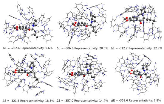 It has been long discussed that the formation of the pre-polymerization complex between the analyte and the building monomers in solution is the driving force of the molecular imprinting process [,,,]. The theoretical study of such a process, for its part, requires a good description of the pre-polymerization complex, but also of the potential energy surface (PES) of the interaction between the analyte and the monomers, which can originate a wide range of different complexes and conformers. In other words, a theoretical study must account for a good sampling of the possible interactions, as much as it needs to describe the monomer-analyte interaction in any given possible compound. In this work, it was sought to achieve this goal by a combination of Monte Carlo sampling simulations and semi-empirical quantum mechanical geometry optimizations and DFT energy calculations, a protocol already presented in the literature in a similar form [].