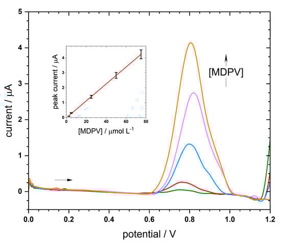 To evaluate the sensitivity of the sensor, its analytical performance towards the oxidation of MDPV was studied by SWV under optimal conditions. As shown in Figure 6, the SWV current response increased with the increase of MDPV concentration. Moreover, two MIP-sensors were tested, the one directly built on the surface of MWCNT and the one constructed on the AgNPs-MWCNTs. Their respective linear regression equations were: ip (in A) = (264 ± 6) × 10−4 [MDPV] (in mol L−1) + (57 ± 5) × 10−8, r2 = 0.9986 (n = 5); and ip (in A) = (567 ± 6) × 10−4 [MDPV] (in mol L−1) + (1 ± 2) × 10−8, r2 = 0.9997 (n = 5). Although both sensors’ response exhibited a good linear relationship between anodic current and MDPV levels, the SPCE-MWCNTs-AgNP-MIP provided a lower limit of detection (LOD) of 1.8 μmol L−1 (vs. 6.3 μmol L−1 of SPCE-MWCNTs-MIP) and quantification (LOQ) of 6.1 μmol L−1 (vs. 21 μmol L−1 of SPCE-MWCNTs-MIP), therefore satisfying the needs for MDPV analysis in forensic samples. When compared to other MDPV analytical methodologies (Table 1), the proposed method exploited the use of an e-MIP to mimic an antigen-antibody bond and turn the procedure quite selective beyond sensitive. In addition, this sensor is a cheaper and more practical alternative to the previously described methods for MDPV analysis, with the advantage of being constructed in a quickly, simple, and inexpensive way.