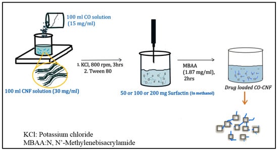 The detailed procedures for particle preparation and characterization were reported in our previously reported work [13]. Briefly, 100 mL of CO (1 g in 100 mL) solution was mixed with 100 mL of CNF solution (30 mg/ ml) and stirred at 80 °C for 10 min. Later, potassium chloride (KCl) was added as a cross-linker and stirred at 80 °C. After 3 h, the particles were collected by centrifugation, and then sonicated (HOYU Ultrasonic 250, Taipei, Taiwan), and freeze-dried. The surfactin-loaded CO-CNF nanoparticles were prepared by the emulsion method. Three types of nanoparticles were prepared in this study such as 50SNPs (50 mg surfactin-loaded CO-CNF nanoparticles), 100SNPs (100 mg surfactin-loaded CO-CNF nanoparticles), and 200SNPs (200 mg surfactin-loaded CO-CNF nanoparticles) based on the concentration of surfactin. 200 µL of Tween 80 was added to 50 mL of CO-CNF solution and stirred for 1h at 60 °C. Afterwards, surfactin (50/100/200 mg in 2 mL methanol) solution was taken and CO-CNF solution was added to it. As a stabilizer, 8 mL of N,N′-methylenebisacrylamide (MBAA) (1.87 mg/mL) was added. After 2 h of reaction, the obtained particles were sonicated and free-dried. A schematic representation of surfactin loaded nanoparticles preparation was given in Figure 1.