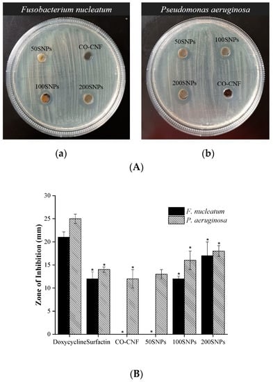 (A) Determination of antimicrobial properties of nanoparticles against (a) Fusobacterium nucleatum and (b) Pseudomonas aeruginosa. (B) Zone of inhibition of nanoparticles. Data are expressed as mean ± SD (n = 3). The asterisk (*) represents a significant difference (p < 0.05) from the positive control (doxycycline) analyzed by Tukey’s test. CO-CNF: κ-carrageenan oligosaccharides linked cellulose nanofibers; 50SNPs: 50 mg surfactin-loaded CO-CNF nanoparticles; 100SNPs: 100 mg surfactin-loaded CO-CNF nanoparticles; 200S NPs: 200 mg surfactin-loaded CO-CNF nanoparticles.