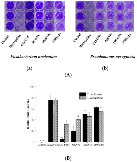 (A)Visualization of biofilm formation by (a) Fusobacterium nucleatum and (b) Pseudomonas aeruginosa and (B) quantification of biofilm inhibition in Fusobacterium nucleatum and Pseudomonas aeruginosa. Data are expressed as mean ± S.D. (n = 3). The asterisk (*) represent a significant difference (p < 0.05) from positive control (doxycycline) analyzed by Tukey’s test. CO-CNF: κ-carrageenan oligosaccharides linked cellulose nanofibers; 50SNPs: 50 mg surfactin-loaded CO-CNF nanoparticles; 100SNPs: 100 mg surfactin-loaded CO-CNF nanoparticles; 200SNPs: 200 mg surfactin-loaded CO-CNF nanoparticles.