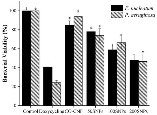 Effects of nanoparticles on the metabolic activity of Fusobacterium nucleatum and Pseudomonas aeruginosa. Data are expressed as mean ± S.D. (n = 3). The asterisk (*) represent significant differences (p < 0.05) from positive control (doxycycline) analyzed by Tukey’s test. CO-CNF: κ-carrageenan oligosaccharides linked cellulose nanofibers; 50SNPs: 50 mg surfactin-loaded CO-CNF nanoparticles; 100SNPs: 100 mg surfactin-loaded CO-CNF nanoparticles; 200S NPs: 200 mg surfactin-loaded CO-CNF nanoparticles.