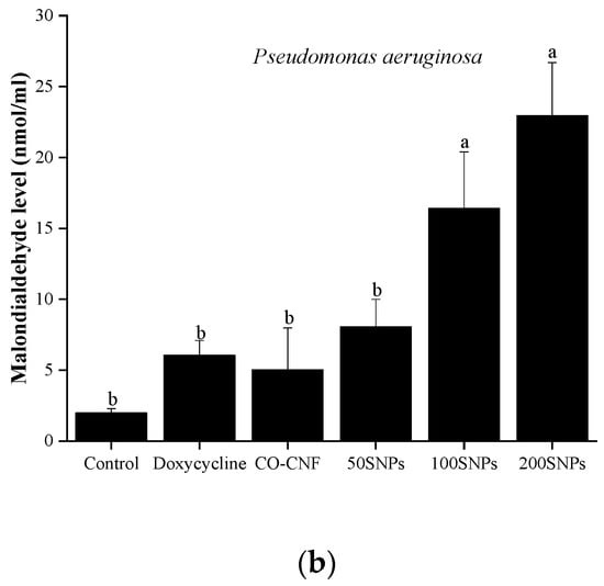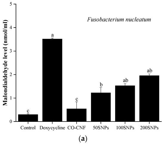 Effects of nanoparticles on the malondialdehyde level of (a) Fusobacterium nucleatum and (b) Pseudomonas aeruginosa. Data are expressed as mean ± S.D. (n = 3). The values with different letters (a–c) represent significantly different (p < 0.05) as analyzed by Tukey’s test. CO-CNF: κ-carrageenan oligosaccharides linked cellulose nanofibers; 50SNPs: 50 mg surfactin-loaded CO-CNF nanoparticles; 100SNPs: 100 mg surfactin-loaded CO-CNF nanoparticles; 200SNPs: 200 mg surfactin-loaded CO-CNF nanoparticles.