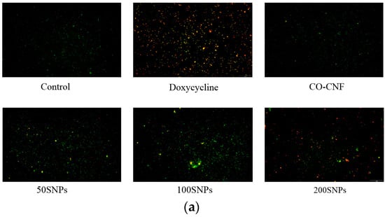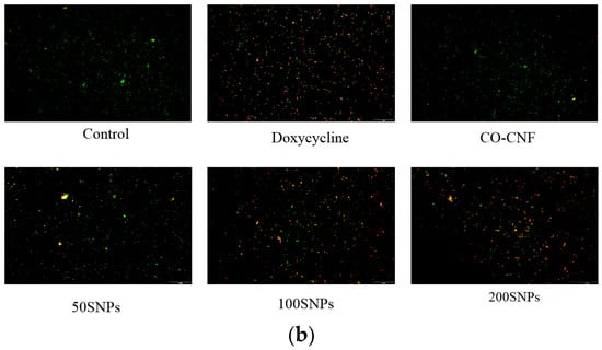 The viability of bacteria after being treated with nanoparticles was confirmed by AO assay (Figure 6). The green color indicating viable cells and the red color indicating the dead cells. It was understood that 200SNPs was stronger against F. nucleatum along with doxycycline. Only a few dead cells were observed in 50SNPs and 100SNPs. More viable P. aeruginosa was seen in both CO-CNF and the control groups. 50SNPs and 100SNPs have dead cells but it was less than 200SNPs and doxycycline.