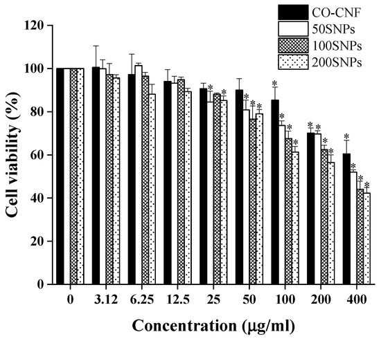 Cell viability of human gingival fibroblast cells (1 × 104 cells/well) in the presence of nanoparticles after 24 h. Data are expressed as mean ± S.D. (n = 3). The asterisk (*) indicated the significant differences of the groups from control at p < 0.05 analyzed by the Tukey test. CO-CNF: κ-carrageenan oligosaccharides linked cellulose nanofibers; 50SNPs: 50 mg surfactin-loaded CO-CNF nanoparticles; 100SNPs: 100 mg surfactin-loaded CO-CNF nanoparticles; 200SNPs: 200 mg surfactin-loaded CO-CNF nanoparticles.