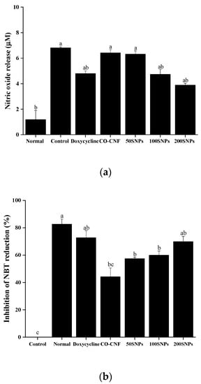 (a) nitric oxide production, (b) inhibition of nitroblue tetrazolium reduction, and (c) malondialdehyde level in nanoparticles treated lipopolysaccharide (LPS) stimulated human gingival fibroblast cells. The cells (1 × 104 cells/well) were pre-treated with 20 µL of samples (50 µg/mL) and 10 µL of LPS (1 µg/mL). Data are expressed as mean ± S.D. (n = 3). The letters (a–c) indicated the significant differences of the groups at p < 0.05 analyzed by the Tukey test. CO-CNF: κ-carrageenan oligosaccharides linked cellulose nanofibers; 50SNPs: 50 mg surfactin-loaded CO-CNF nanoparticles; 100SNPs: 100 mg surfactin-loaded CO-CNF nanoparticles; 200SNPs: 200 mg surfactin-loaded CO-CNF nanoparticles.