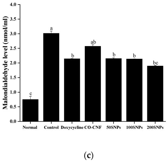 The imbalance between the production of ROS and antioxidant levels leads to oxidative stress and associated inflammation [44]. NO, superoxide anion, and MDA generation in nanoparticles treated LPS-stimulated HGF cells were given in Figure 8. NO is a free radical and the level of NO is increased under periodontitis condition by the activity of bacterial LPS and pro-inflammatory mediators [45]. As shown in Figure 8a, the NO production was higher in the control group and lower in the normal group. NO production in both CO-CNF and 50SNPs was not significantly different from the control group. NO production was reduced in doxycycline and 100SNPs. However, it was higher when compared to 200SNPs. Superoxide anion is another ROS responsible for oxidative stress within the tissues. The production of superoxide anion was highly reduced in doxycycline and 200SNPs, along with the normal group (Figure 8b). Both 50SNPs and 100SNPs were not statistically different, and the inhibition percentage was higher than CO-CNF. MDA is produced as the result of the peroxidation of polyunsaturated fatty acids and it is recognized as the marker of oxidative stress [44]. As shown in Figure 8c, the MDA level was highly increased in the control group and reduced in the normal group. The MDA level in three groups such as doxycycline, 50SNPs, and 100SNPs was not statistically different. Besides, it was lower than the CO-CNF group. Furthermore, it was observed that the MDA production was highly reduced in 200SNPs when compared to other groups.