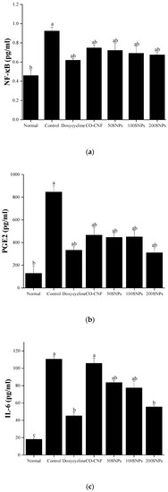 Periodontitis is an inflammatory disease associated with a high level of pro-inflammatory cytokines. The levels of NF-κB, PGE2, and IL-6 after treatment with nanoparticles were given in Figure 9. It was noted that NF-κB expression was increased in the control group and highly reduced in the normal group (Figure 9a). A slight reduction in NF-κB expression was observed upon the increasing concentration of surfactin but they were not significantly different. Doxycycline showed a notable reduction in NF-κB expression, but it was not statistically different except for control and normal groups. Like NF-κB, the PGE2 level was also higher in the control group (Figure 9b). CO-CNF, 50SNPs, and 100SNPs shared almost equal PGE2 level, but it was significantly higher than doxycycline and 200SNPs. PGE2 levels in both doxycycline and 200SNPs were not statistically different but doxycycline contained a higher level of PGE2 than 200SNPs. The amount of IL-6 was given in Figure 9c. A higher level of IL-6 was observed in the control group followed by CO-CNF. IL-6 level was reduced in both 50SNPs and 100SNPs but it was higher than 200SNPs. IL-6 level in doxycycline was not statistically different when compared to 200SNPs but it is lesser than 200SNPs.