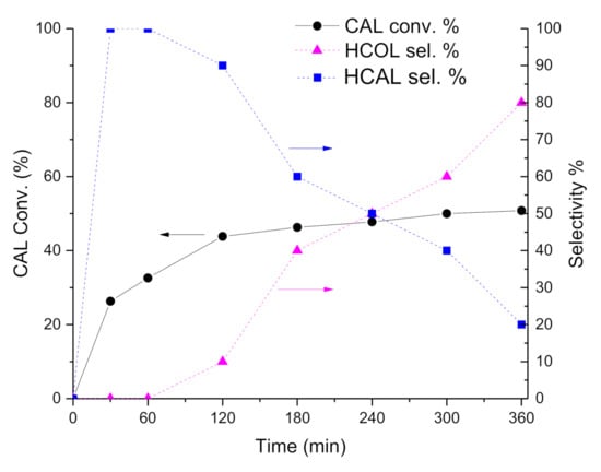 Cinnamaldehyde hydrogenation has been carried out in a batch autoclave equipped with a glass inlet, at 80 °C and 5 bar of H2. The amount of the catalyst was calculated in order to have a metal:substrate molar ratio equal to 1:1000. The starting concentration of CAL was 0.15 M in 2-propanol. GC analyses performed by a Thermo Scientific TRACE 1300 Instrument (Waltham, MA, USA) equipped with an Agilent HP-5 column gave CAL conversion and products formation over time, using undecane as an external standard. Sampling occurred at time 0 and every 30 min, until the end of the reaction. The quantification of products was performed by calibrating the response with authentic samples.