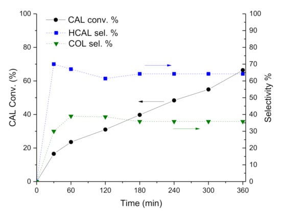 Concerning with selectivity, the Pt-Mo(NH4)_400N catalyst (Figure 2) initially converted CAL into HCAL quantitatively, but after 1 h of reaction (at about 30% of CAL conversion), HCAL started to be converted to HCOL, which reached a selectivity of 76.4% at 6 h of reaction (at 50.8% of CAL conversion). Differently, in the presence of Pt-Mo(Na)_400N (Figure 3), COL and HCAL seems to be formed contemporary, reaching a steady state, with a selectivity to COL and HCAL around 35% and 65%, respectively (see Table 2), regardless of the conversion.