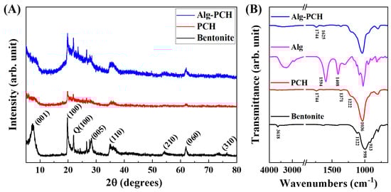 (A) Powder X-ray diffraction patterns of bentonite, PCH, and Alg-PCH (Q; quartz) and (B) FT-IR spectra of bentonite, PCH, alginate, and Alg-PCH.