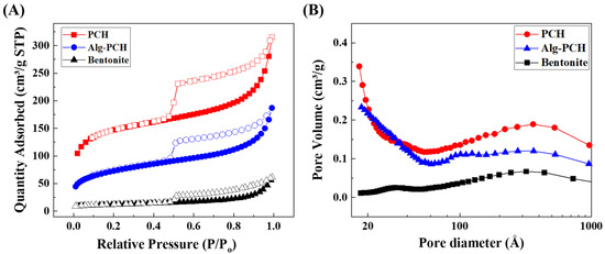 (A) N2 adsorption–desorption hysteresis loop and (B) pore volume distribution graph of bentonite, PCH, and Alg-PCH.