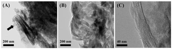 To investigate the morphological changes of parent bentonite, PCH, and Alg-PCH, TEM analysis was carried out (Figure 3 and Figure S1). As shown in Figure S1, parent bentonite shows a characteristic well-ordered layered structure [50,61]. After introducing organic moieties into the bentonite layer, the well-ordered layered structure was transformed into a disordered structure, which corresponds well with PXRD results (Figure 1). After the polymerization of PCH with alginate, bentonite layers were re-ordered compared to PCH and alginate polymer (black arrow in Figure 3A is the covered PCH). To evaluate the detailed layered structure in Alg-PCH, a TEM specimen was prepared with Spur’s resin and sectioned by ultramicrotome (Figure 3B, C). From the TEM images of the sectioned Alg-PCH, the characteristic PCH layers show a better organized structure than PCH itself, which is also well matched with the increment in diffraction patterns of (001) attributed to the c-axis stacking of bentonite.