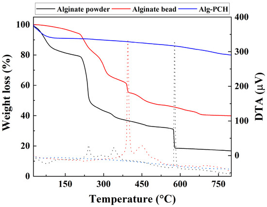 The thermal stability of alginate is also an important factor for its use as an adsorbent for VOCs in laundry facilities due to the high temperature gases produced. Thermal gravimetric and differential thermal analyses were carried out with alginate powder, powered alginate beads, and Alg-PCH (Figure 4). The alginate powder showed three steps of thermal decomposition in the range of 25–100 °C, 100–250 °C, and above 250 °C. From DTA results, the first endothermic peak appearing at around 75 °C was probably attributed to the water loss of hydrophilic functional polymeric groups and the following exothermic peaks appeared around 240, 339, and 577 °C, corresponding to the polymer degradation and decomposition [62]. After polymerization with CaCl2, the characteristic exothermic peaks of alginate were shifted to higher temperatures from 240 and 339 °C to 394 and 450 °C, respectively. In addition, the weight loss difference of alginate and alginate beads was approximately 24%, which also supported the enhancement of thermal stability of alginate. The TG and DTA curve of Alg-PCH showed a 10% weight loss without characteristic exothermic peaks of alginate. Considering the weight loss of surface water of the sample (around 10% at 100 °C) and PCH itself, thermal stability of Alg-PCH showed enhanced thermal stability.
