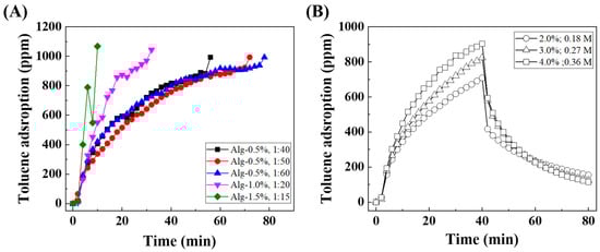 (A) Toluene adsorption curve depending on alginate concentration and weight ratio between alginate and PCH; (B) toluene adsorption–desorption curve of Alg-PCH depending on concentration of CaCl2 solution (circle; 2%, triangle; 3% and square; 4%) with 40 min cycle.