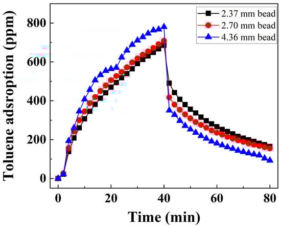 Toluene adsorption–desorption curve of Alg-PCH depending on the bead size with 40 min cycle.