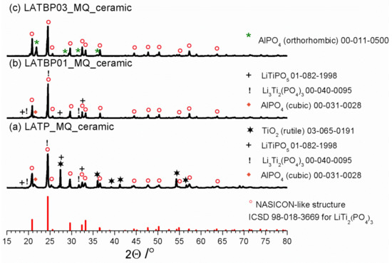 XRD studies for LAT(B)P_MQ series after heat-treatment at 900 °C for 12 h are displayed in Figure 2. Due to the heat-treatment, LATP_MQ_glass transforms into a ceramic material. A thorough analysis of its phase composition with the use of ICDD crystallographic database patterns, reveals that apart from the predominant NASICON-type LiTi2(PO4)3 phase (∘), other crystalline phases also crystallize. In particular, one can observe the formation of rutile TiO2 (✶) and cubic AlPO4 (◆). Trace amounts of the lithiated L(A)TP (!) and LiTiPO5 (+) phases can also be detected.