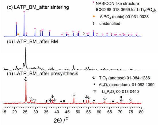 Diffractogrrams presenting different stages of LATP_BM_ceramic formation: (a) after presynthesis at 350 °C for 3 h; (b) after ball-milling at 600 rpm for 72 h; (c) after heat treatment at 900 °C for 12 h.