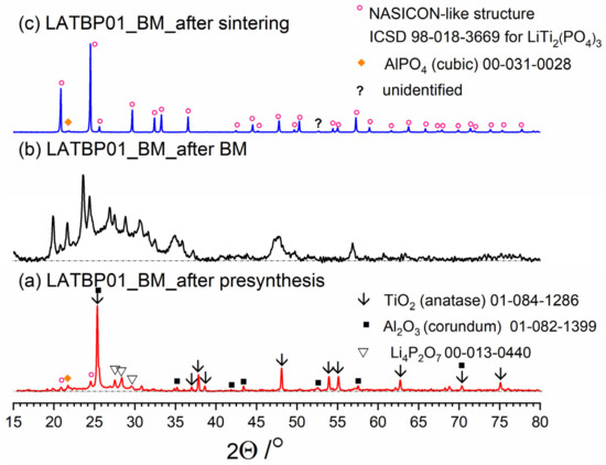 Diffractograms presenting different stages of LATBP01_BM_ceramic formation: (a) after presynthesis at 350 °C for 3 h; (b) after ball-milling at 600 rpm for 72 h; (c) after heat treatment at 900 °C for 12 h.