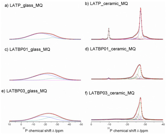 For crystallized LAT(B)P_MQ samples, narrower resonances could be distinguished (Figure 7b,d,f). In the case of glass–ceramic LATP (Figure 7b), asymmetric resonance at −27.5 ppm could be deconvoluted into Gaussian/Lorentzian lines with isotropic chemical shifts of: −30.5, −27.9, −27.5, −26.5, −25.9, −25.0 and −24.1. The signal at −30.5 ppm can be assigned to phosphorus in crystalline AlPO4 phase [30,55]. The resonance at −22.6 could be due to the residual glassy phase. Subsequent overlapping lines may be attributed to two LATP phases with similar chemical composition. The resonances at −27.9 and −26.5 ppm correspond to phosphorus P(OTi)4 and P(OTi)3(OAl)1 environments in LATP (I) phase. While, the peaks at −27.5, −25.9, −25.0 and −24.1 ppm can be assigned, respectively to P(OTi)4-n(OAl)n (n = 0, 1, 2 and 3) bands in LATP (II) phase [26,30,51,55]. It is worth mentioning that 27Al MAS NMR results also revealed two Al3+ environments, suggesting coexistence of two LATP phases. The 31P MAS NMR spectrum for LATP_ceramic_MQ exhibits also a signal at −22.6 ppm, ascribed to residual glassy phase. Moreover, except for the aforementioned signals, two additional resonances at −9.8 and −6.4 ppm could be discerned. They can be attributed to LiTiPO5 and Li4P2O7 phases, respectively [51,56,57].