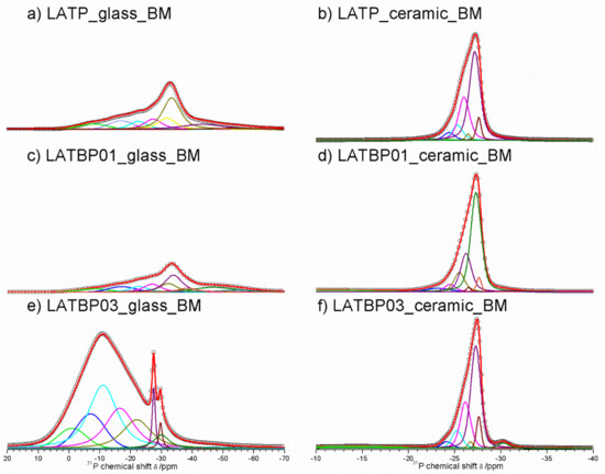 Figure 11a,c,f presents 31P MAS NMR spectra for amorphous LATP, LATBP01 and LATBP03 materials. Spectra for LATP and LATBP01 are nearly the same. They are characterized by an asymmetric peak at −27.3 ppm with significant widening of the signal for lower intensities. The deconvolution of spectra resulted in the occurrence of six overlapping Lorentzian line-shapes around: −37.5, −27.6, −26.2, −22.0, −15.0 and −7.0 ppm. Wide signals at −37.5, −15.0 and −7.0 ppm may be attributed to precursors of AlPO4, LiAlP2O7 and LiTiPO5 compounds, respectively; while the resonances at −27.6, −26.2 and −22.0 ppm can be, respectively, assigned to the phosphorus environment in P(OTi)4−n(OAl)n (n = 0, 1 and 2) [26,30,51,56]. More significant changes may be observed for amorphous LATBP03 material. First of all, a wide asymmetric peak around −11 ppm may be found. Except for the lines included in this peak, one can also observe three further narrower signals at −30.0, −29.7 and −27.5 ppm. The signals at −30.0 and −29.7 ppm might be assigned to AlPO4 phase, while the one at −27.5 ppm to LATP compound. Therefore, when considering the wide signal and the low content of NASICON-type and aluminophosphate compounds, we can conclude that the amorphization of the LATBP03 sample is higher than in the case of LATP and LATBP01, which was also observed in XRD investigations.