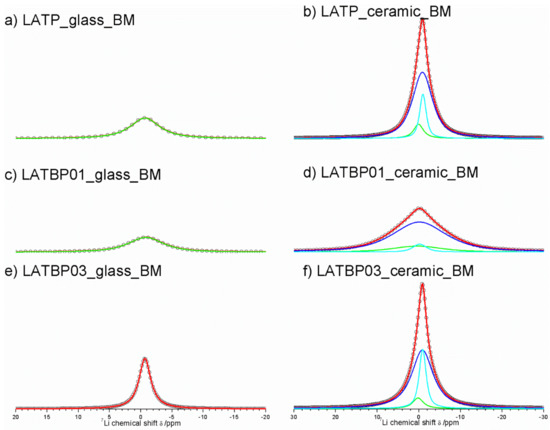 1D 7Li MAS NMR spectra of the LAT(B)P_BM series. (a) LATP_glass_BM (b) LATP_ceramic_BM (c) LATBP01_glass_BM (d) LATBP01_ceramic_BM (e) LATBP03_glass_BM (f) LATBP03_ceramic_BM.
