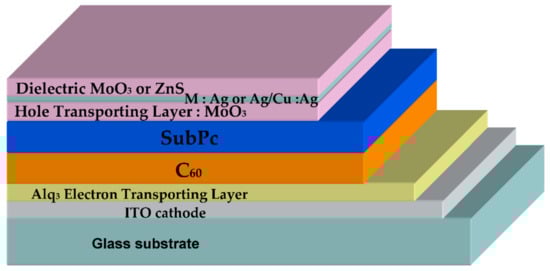 The growing interest in organic photovoltaic cells (OPVs) is due to the fact that they possess some specific advantages such as light weight, intrinsic flexibility, and possible semi-transparency of organic thin films [1]. More specifically, semi-transparent OPVs attract strong interest due to the efforts currently directed toward building integrated photovoltaics (BIPVs). Recently, much research has focused on improving OPV efficiency [1,2,3,4], but some applications, such as BIPV, induce the use of semi-transparent OPVs, which are less efficient than the usual opaque OPVs because they have to transmit a significant amount of visible light [5,6]. Therefore, for semi-transparent OPVs, it is not appropriate to use optimal organic layer thickness. It is known that, the diffusion length of excitons being smaller than the organic layer thickness necessary to absorb light, the geometry of bulk heterojunction (BHJ) was used with success [7,8,9,10,11], while in the case of planar heterojunctions (PHJs), the excitons created too far from the electron donor/electron acceptor interface are lost, which, contrary to the case of BHJs, limits the thickness of PHJs and, therefore, their efficiency [12]. However, as said above, in the case of semi-transparent OPVs, we must not use the optimum thickness to preserve some OPV transparency, so we chose the PHJ–OPV configuration to grow semi-transparent devices. Such configuration allows for using small molecules and deposition under vacuum. Small molecules have a number of benefits such as easy preparation and purification and a unique final molecule that prevents the problem of batch-to-batch reproducibility [13,14,15]. Furthermore, the thermal deposition technique allows for easy fabrication of multilayer devices with precise control of the thickness of each layer [16,17]. Usually, the electrodes of opaque OPVs consist of a transparent conductive electrode (TCE), often an ITO (Indium Tin Oxide) thin film deposited onto a glass substrate, and a metal electrode, often aluminum. The high reflectivity of Al allows light to be reinserted into the organic layers. To achieve semi-transparent OPVs with acceptable performances, the main challenge is the substitution of a transparent electrode with high conductivity with a metal electrode [18]. Different solutions are possible, among them, dielectric/metal/dielectric (DMD) structures [19,20]. They possess quite equilibrated optical and electrical properties; moreover, they are easy to realize given the technique we have chosen to use via successive thermal sublimation/evaporation. In DMD, M allows obtaining small sheet resistance, but its high reflectivity strongly penalizes the light transmission. Thus, to obtain the transmission of the visible light, it is necessary to sandwich the M layer between two high refractive index dielectrics. MoO3 is one of the possible dielectrics; it is well known that it is very efficient as a hole-transporting layer (HTL) at the anode/electron donor interface [21,22]. Therefore, in the present work, MoO3 was chosen as the dielectric. As for the metal, Ag is commonly selected because it exhibits the highest metal conductivity coupled with the lowest absorption in the visible range among the metals [23]. Nevertheless, Ag is quite expensive, and it would be of high interest to use a cheaper metal. Therefore, we also used Cu, whose optical and electrical properties are very close to those of Ag. Unfortunately, Cu tends to diffuse into transition metal oxides such as MoO3 [24], so we tried to improve DCuD stability through the use of ZnS dielectric and Cu:Ag alloy [25]. After optimization, these DMD electrodes are used as top electrodes in inverted OPVs, such as ITO/Alq3/C60/SubPc/DMD. We chose the inverted OPV configuration due to its better stability [26]. The study shows that, even after the DMD structure optimization, the best results are obtained with DagD top electrodes. In comparison with the reference OPV, i.e., with Al as the top electrode, the efficiencies of the semi-transparent OPVs are only 20% smaller, but with a transparency of nearly 50% in a broad range of the visible light (400–600 nm).