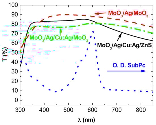 Figure 3 displays the spectral transmission of the complete OPVs: ITO/Alq3/C60/SubPc/DMD, the DMD top electrode being either MoO3 (10 nm)/Ag (10 nm)/MoO3 (35 nm) or MoO3 (10 nm)/Ag (2 nm)/Cu:Ag (15 nm)/ZnS (45 nm).