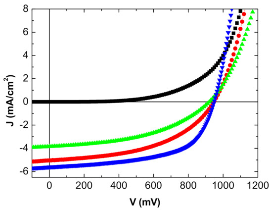 The J-V characteristics of the inverted OPVs are shown in Figure 4 and Figure 5 and summarized in Table 2.