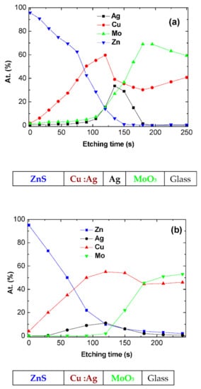 The XPS profile obtained on such glass/MoO3/Ag/Cu:Ag/ZnS multilayer structure is reported in Figure 6. To check the influence of the thin Ag layer introduced between the Cu and MoO3 layers, we also present the profile of a glass/MoO3/Cu:Ag/ZnS multilayer structure in Figure 6b. It can be seen that even if Ag limits the Cu diffusion into MoO3, without Ag, the profile Cu/Mo is flat, and there is a significant diffusion of Cu into Mo, with 40 at.% of Cu present at the interfacing electrode/organic material. Nevertheless, in comparison with Figure 6b, at the center of the structure, when the thin layer of Ag is present, the atomic concentration of Cu is higher, while, on the other hand, it is lower in the MoO3 layer. This shows the effectiveness of this thin Ag layer in limiting the diffusion of Cu. However, the presence of a relatively high concentration of Cu at the interface has a negative effect on the OPV performances. We have already shown that if an ultra-thin layer of 0.6 nm of Cu is an efficient anode buffer, this positive effect is destroyed when Cu is present in a thicker layer [33], which is the case at hand. The diffusion of Cu induces a decrease of the shunt resistance, resulting in poor rectifying properties. Moreover, the Cu diffusion results in an increase of the sheet resistance of the electrode. All that results in a decrease in the values of Voc, Jsc, FF, and efficiency. As in the case of MoO3/Ag/MoO3, the performances are smaller when the OPV is illuminated from the top anode side, for the same reasons.
