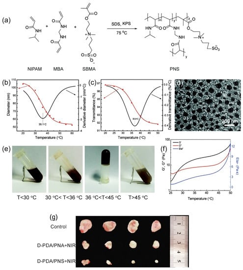 Zwitterionic thermosensitive PNS nanogels. (a) Schematic synthesis of PNS nanogels. (b) Temperature dependence of hydrodynamic diameters and (c) temperature dependence of PNS transmittance. (d) TEM image. (e) Photos of the sol–gel phase transition. (f) Rheology of the sol–gel phase transition. (g) In vivo antitumor effect: the corresponding photographs of the peeled tumors after intratumoral injection for 14 days. Reproduced from [29], with permission from © The Royal Society of Chemistry 2020.