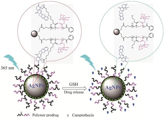 Recent work described a hybrid nanoparticle-based system for controlled release of anticancer drugs. The system was obtained from P[(2-((2- ((camptothecin)-oxy)ethyl)disulfanyl)ethylmethacrylate)-co-(2-(D-galactose)methylmethacryl-ate)] P(MACPTS-co-MAGP)@AgNPs nanoparticles and camptothecin (CPT) was linked to the system by disulfide bonds. As shown in Figure 7, in the presence of GSH, the release of the drug is initiated, leading to the fluorescence “turn-on” of CPT [88].