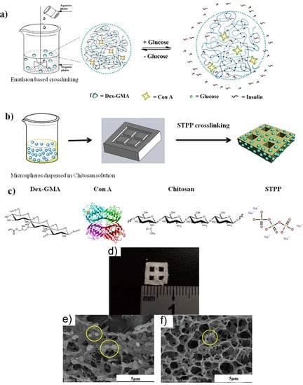 A glucose-sensitive platform: schematic representation of (a) synthesis of glucose-responsive microspheres; (b) scaffold preparation. (c) The chemical structure of system components. SEM images of (d) surface, (e) cross-section, and (f) scaffold containing insulin-loaded microspheres. Reproduced from [105], with permission from © 2018 Elsevier.