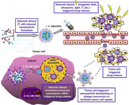 Scheme of internal and external multi-stimuli action in the case of a polymeric nanoparticle material. Reproduced from [127], with permission from © 2013 Elsevier.