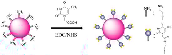 In a typical synthesis procedure of AET-functionalized Au NPs (Au NPs/AET), 290 μL HAuCl4·4H2O (1%) and 170 μL AET (213 mM) were dissolved with 79.71 mL ultrapure water, then we slowly stirred it for 20 min in darkness. Then, 4.2 μL NaBH4 solution (18 mM) was added into the mixture with stirring for 10 h. As shown in Figure 2, for the preparation of thymine-functionalized Au NPs (Au NPs/T), 0.1 mM T-COOH was activated by 10 mM EDC/NHS solution (MES buffer solution, 1 mM, pH 6) for 15 min at 25 °C with constant stirring. After that, 0.3 mL of carboxyl-activated T-COOH was added into 5 mL Au NPs/AET solution with stirring at room temperature for 4 h.