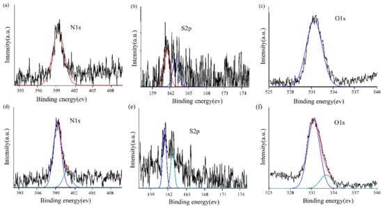 The XPS spectra of Au NPs/AET and Au NPs/T: (a) N1s spectrum of the Au NPs/AET; (b) S2p spectrum of Au NPs/AET; (c) O1s spectrum of the Au NPs/AET; (d) N1s spectrum of the Au NPs/T; (e) S2p spectrum of Au NPs/T; (f) O1s spectrum of the Au NPs/T.