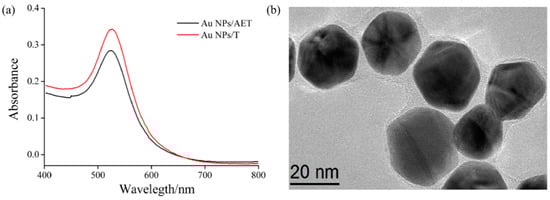 The characterization of Au NPs: (a) UV–vis absorption of Au NPs/AET and Au NPs/T; (b) TEM image of Au NPs/T.