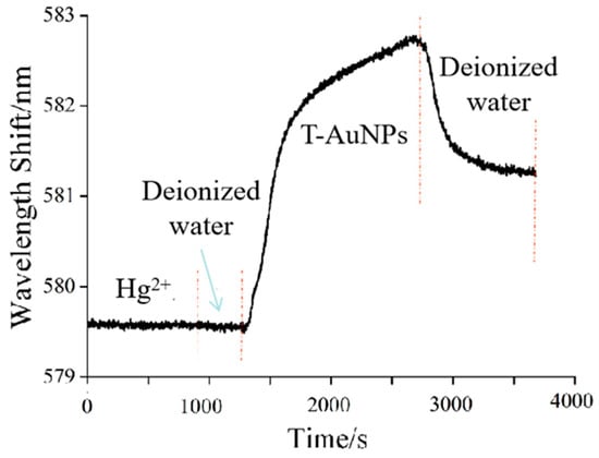 Under optimized conditions for the preparations of signal amplification tags and sensing surface, the quantitative determination of Hg2+ ions was conducted through the SPR signal response. As shown in Figure 9a, the shift in resonance wavelength of SPR increased with the increasing Hg2+ ion concentration. For the sensing process, Hg2+ ions are just like a connection bridge which is first captured by the T on the Au film surface of fiber-optics to produce Hg2+-T complex, and then the captured Hg2+ ions combine with the T modified on the surface of the Au NPs, thus forming a stable Au/T-Hg2+-T/Au NPs sandwich structure, resulting in the shift of the SPR resonance wavelength. Obviously, such a sandwich structure is highly dependent on the concentration of Hg2+ ions. Figure 9b shows the corresponding linear region of Hg2+ ions’ concentration and SPR resonant wavelength; it can be seen that the SPR resonant wavelength and Hg2+ ions’ concentration represented a linear relation in the concentration range of 0~0.2 μM. The correlation coefficient of the linear relation was 0.985 after linear fitting. The LOD of the present sensor for Hg2+ ion detection was calculated to be 9.98 nM (S/N = 3), which is lower than the World Health Organization (WHO) guideline value for Hg2+ ions in drinking water. Table 1 shows the comparison between our proposed sensor and other SPR sensors for Hg2+ detection. It can be seen that the present SPR sensor is comparable to the detection limits obtained by other SPR sensors.