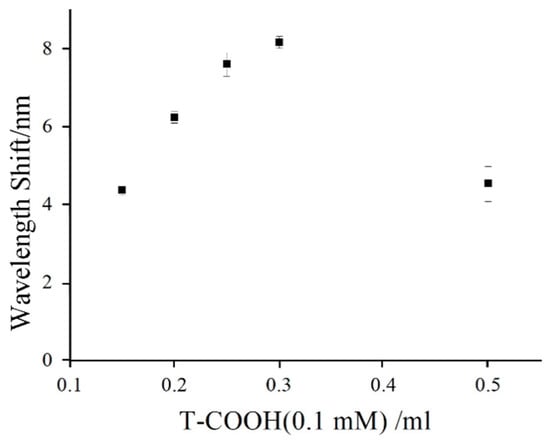 In order to find out the optimal ratio of AuNPs/AET solution and T-COOH for the preparation of Au NPs/T tags, we made carboxyl-activated 0.1 mM thymine-1-acetic acid solutions of 0.1, 0.15, 0.2, 0.3, and 0.5 mL; and a hybrid reaction with an AuNPs/AET solution of 5 mL, respectively. The reaction products were used for mercury ion detection. According to the SPR signal, 0.3 mL mixed solution of thymine-1-acetic acid and EDC/NHS showed a maximum SPR resonant wavelength shift after reacting with Au NPs/AET (Figure 8). Therefore, the optimum volume ratio is 3:50. It can be seen that compared with the Au NPs/AET, the location of the ultraviolet absorption peak of Au NPs/T showed no obvious change (Figure 4), which indicated that the combination of Au NPs surface and thymine would not change the stability of Au NPs.