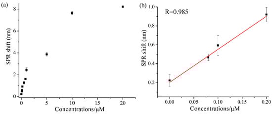 SPR signal responses of Hg2+ detection: (a) different concentrations of Hg2+ samples (0–20 μM); (b) linear range for Hg2+ determination at the concentrations ranging from 80 to 200 nM.