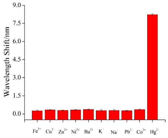 As an alternative and supplement to traditional Hg2+ ion content analysis and detection practice, nanosensors are developing fast due to their good compatibility in analysis and detection. They have the advantages of high sensitivity, high specificity and stability, ease of operation, fast response, and so on [18,19,20]. Among them, the fiber-optic SPR sensor has the features of anti-interference, low cost, and easy integration, and it consumes few samples without the need for labeling. It has been widely used in environmental monitoring, the food industry, clinical medicine, and other fields [21,22,23]. The fiber-optic SPR sensor has already been used for Hg2+ detection: Raj et al. reported using a fiber-optic SPR sensor for Hg2+ ion detection by utilizing an Au NPs–polyvinyl alcohol (PVA) hybrid as a sensing material, however, the limit of detection (LOD) was only down to 1 × 10−6 M [24]. Taking advantage of a chitosan (CS)/polyacrylic acid (PAA) multilayer as the sensitive film, Chen et al. demonstrated that the detection sensitivity of a fiber-optic SPR Hg2+ ion sensor was up to 0.5586 nm/μM [25].
