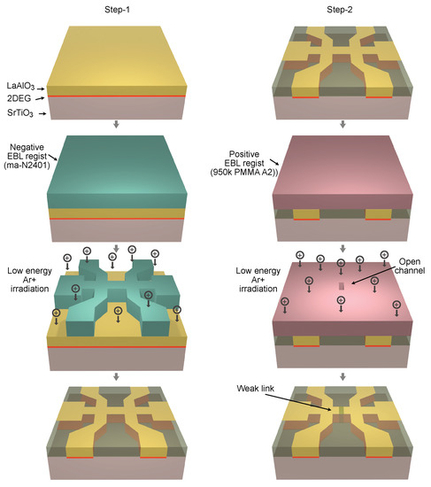 Two-step fabrication process for weak links in the LAO/STO interface. In the first step, narrow channels are created by electron beam lithography and low-energy ion irradiation. In the second step, the weak links are created by low dose Ar ion irradiation through a slit across the prefabricated channel using electron beam lithography and a positive e-beam resist.