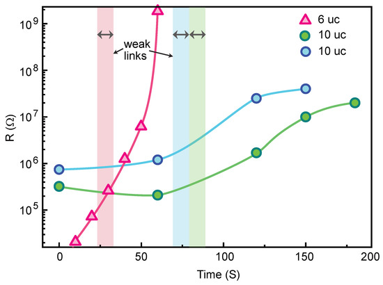 Electrical resistance as a function of Ar ion beam irradiation time for three different LAO/STO samples (one 6 uc and two 10 uc thick) patterned using electron beam lithography and the negative e-beam resist ma-N2401. All samples were cleaned in RF oxygen plasma for 10 s prior to the irradiation process. Vertical bars indicate the time interval used in the second Ar ion irradiation of weak links. The electrical resistance was measured in situ during the ion irradiation process in a two-probe configuration. The Ar ion beam acceleration voltage was 150 V, and the ion current was 30 A/cm.