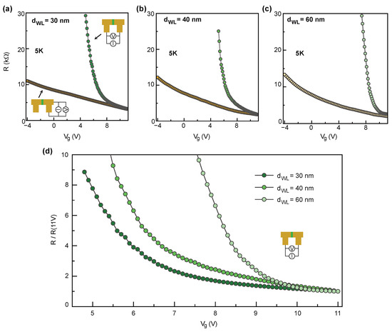 First, we investigated transport properties of fabricated devices in the normal state. Figure 4a–c shows dependence on the global back gate voltage of the resistances across the weak links with different barrier thickness and of a uniform part of the nanowire measured at 5 K in two point configuration. The resistance of the weak link increases much faster as compared to the uniform channels when the gate voltage is decreased from +11 to +5 V. This indicates that the weak links have indeed much higher resistivity as compared with the electrodes. Figure 4d shows comparison of normalized resistance across the weak links with different barrier thickness as a function of back gate voltage. The resistivity of the weak links increases with barrier thickness that further proves the feasibility of the fabrication approach for weak links.