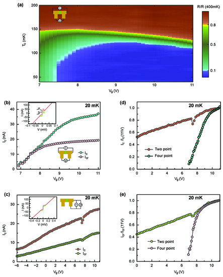 Figure 5a shows a color plot of the resistance normalized to the resistance at 400 mK for the weak link device with barrier thickness of 30 nm as a function of temperature and gate voltage. The maximum critical temperature is about 150 mK. The temperature dependence of the resistance does not show the presence of an additional transition that can be associated with the weak link barrier, indicating that the weak link barrier remains non-superconducting within the whole range of gate voltages. Figure 5b,c shows dependencies of critical and return currents extracted from measured I–V characteristics (shown in insets of Figure 5b,c) as a function of gate voltage for the weak link and the uniform part of the channel, correspondingly. Weak links were measured in four-probe configuration, while two probe configuration was used for uniform channels. Measurements were performed at the base temperature of the dilution refrigerator of 20 mK. The critical current of the weak link is suppressed much faster the one of the uniform channel. This agrees with gate voltage ranges obtained from normal resistance measurements; see Figure 4. Figure 5d,e shows the gate voltage dependence of the normalized critical current and return current for each configuration. Interestingly, the return current of the weak link device follows the one of the uniform channel and is suppressed only when the critical current becomes very low.