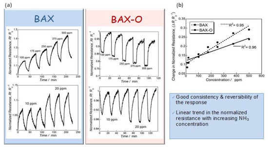 (a) Dependence of BAX and BAX-O responses (upper panel) on the NH3 concentration and reproducibility of the resistance changes (lower panel) and (b) the linear response of the sensors on NH3 concentration (upper panel). Adapted with permission from Reference [20]. Copyright 2015, The Royal Society of Chemistry.